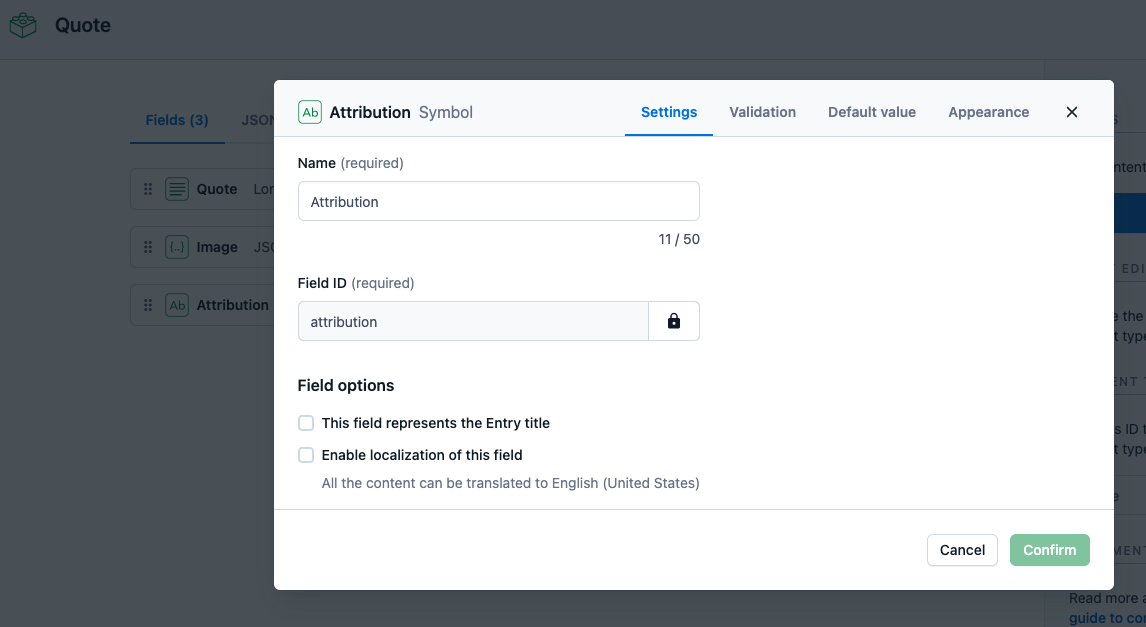 <figure><img src="https://882838265-files.gitbook.io/~/files/v0/b/gitbook-x-prod.appspot.com/o/spaces%2Fq7UE1cAwz12WuyrFSyXF%2Fuploads%2F2rr9OaH5qXZTna9dPxM8%2Ffields.png?alt=media&#x26;token=d2943b8f-c82b-4943-9de6-0bf7f75286b6" alt=""><figcaption><p>The Display Name and Field ID fields and values in a Quote content model in Contentful.</p></figcaption></figure>