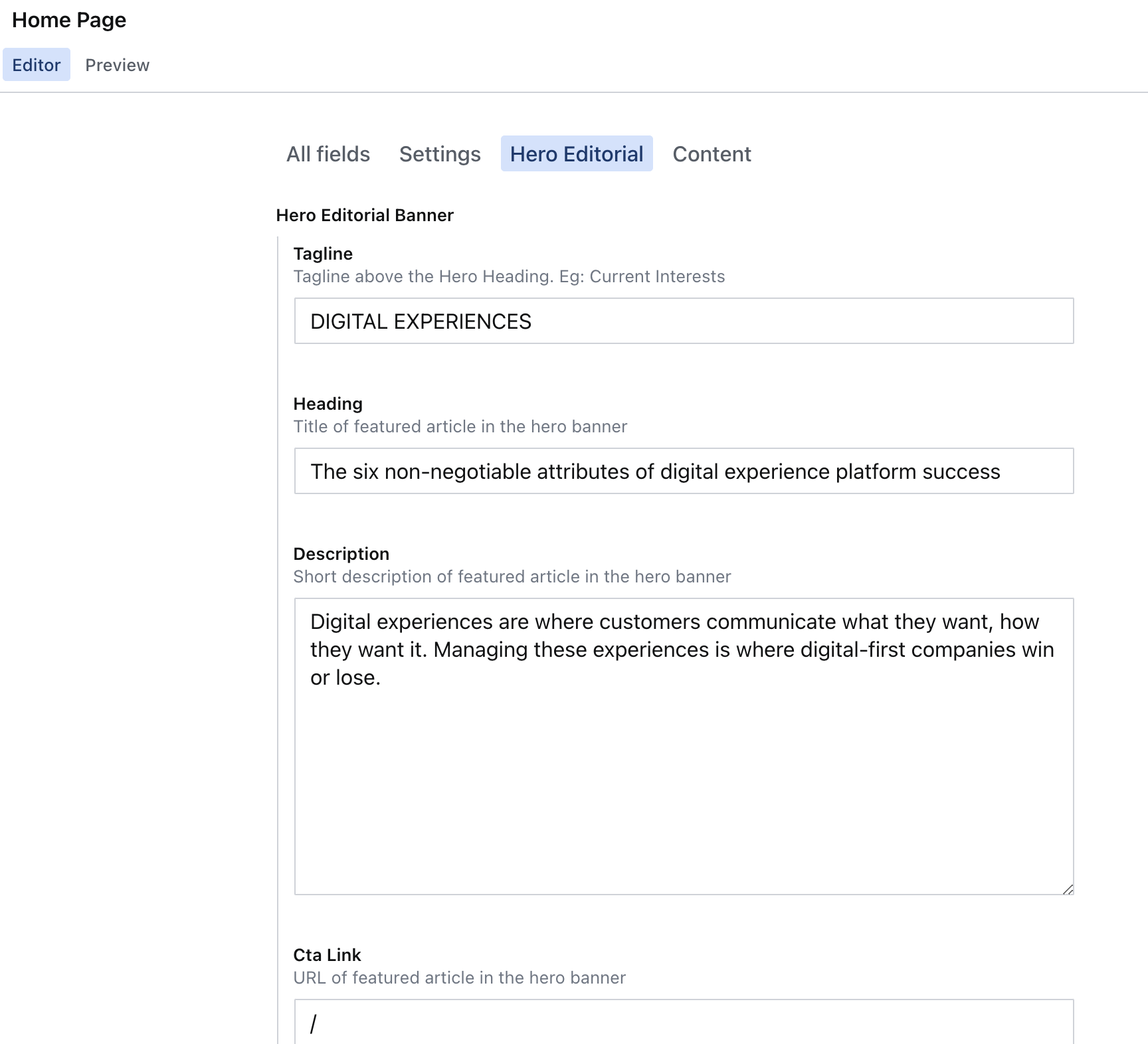 <figure><img src="https://882838265-files.gitbook.io/~/files/v0/b/gitbook-x-prod.appspot.com/o/spaces%2Fq7UE1cAwz12WuyrFSyXF%2Fuploads%2F5G9mbemwv9FcXDkWmmIH%2Fhybrid.png?alt=media&#x26;token=d7821b72-ba8e-4b03-8c26-f2f3e57c5990" alt=""><figcaption><p>An example of the static hero editorial component on a hybrid home page on Sanity.</p></figcaption></figure>