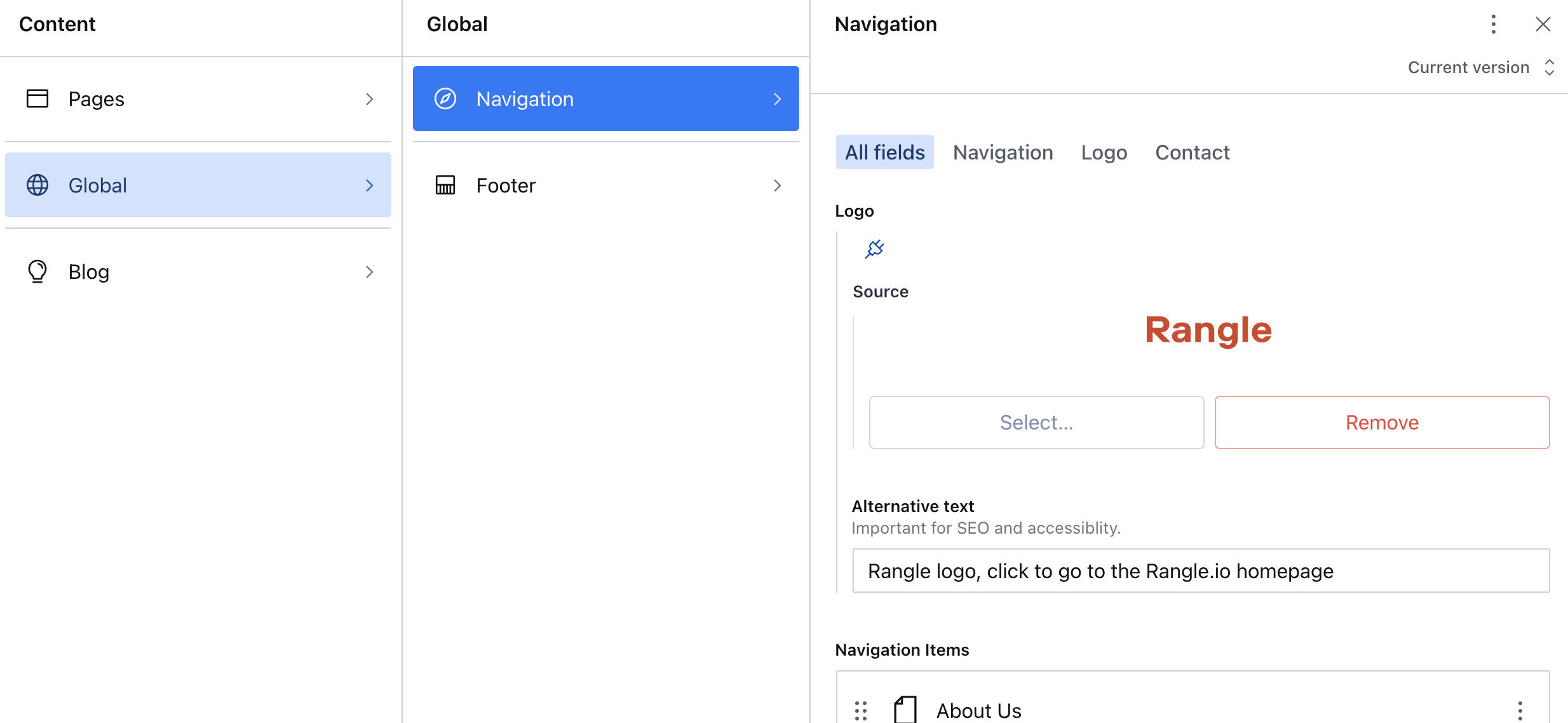 **Global page modules** are modelled and used once for the entire site. They contain content that only needs to be defined once and are not unique per page. Navigation and Footer are good examples since they tend to be the same on every single page. With global page modules, we won’t ever see them referenced in any other content models and will live at a global level.