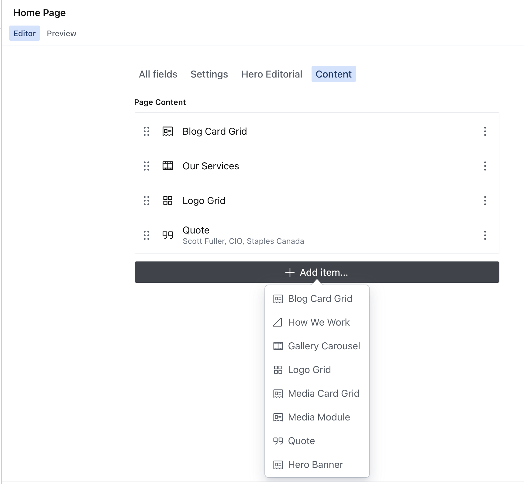 **Reusable page modules**, as the name suggests, are meant to be modelled once and used in multiple places with different content. Header, Accordion, and Quote components are good examples of reusable page modules that we can picture appearing on various different pages.
