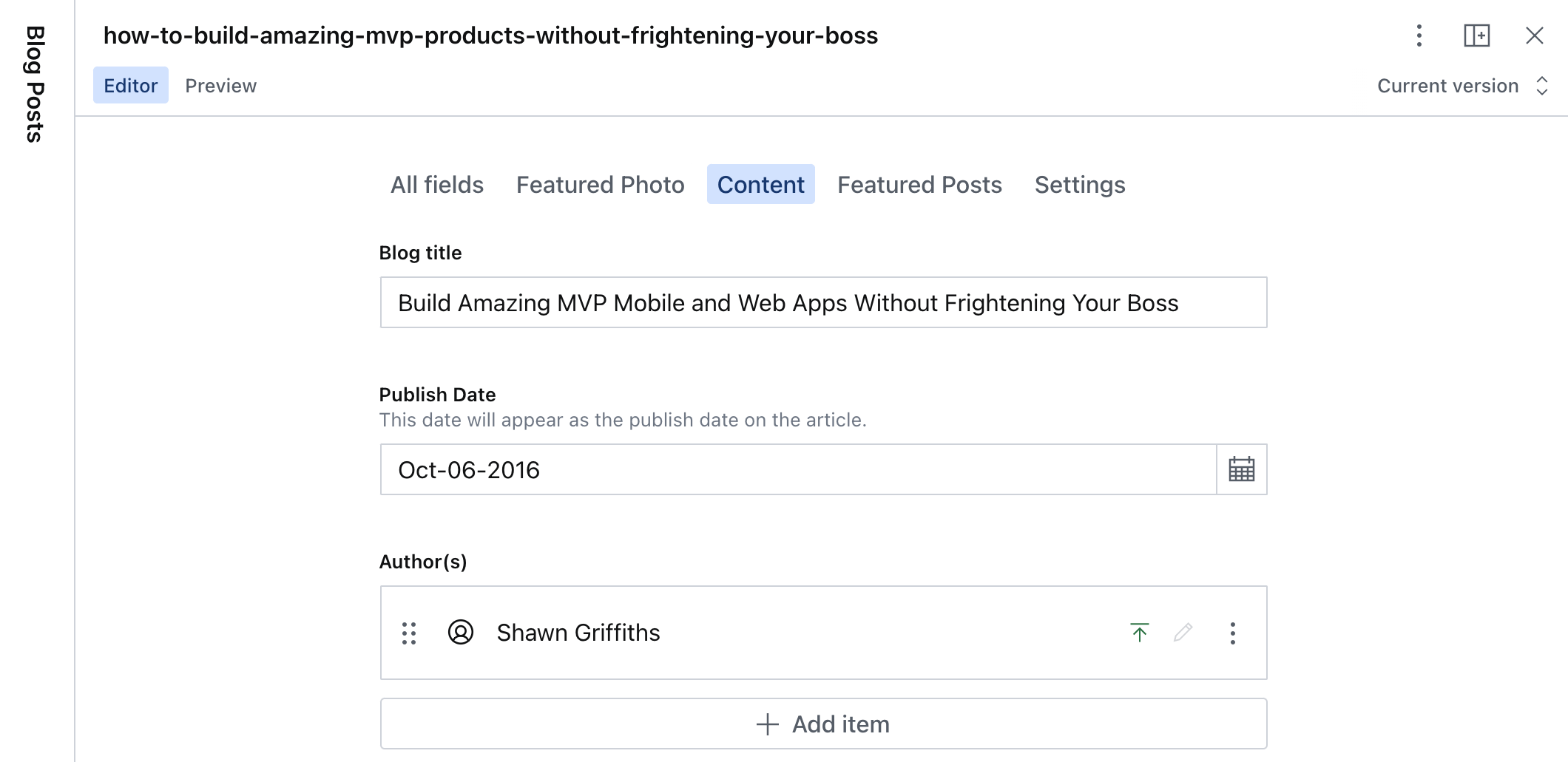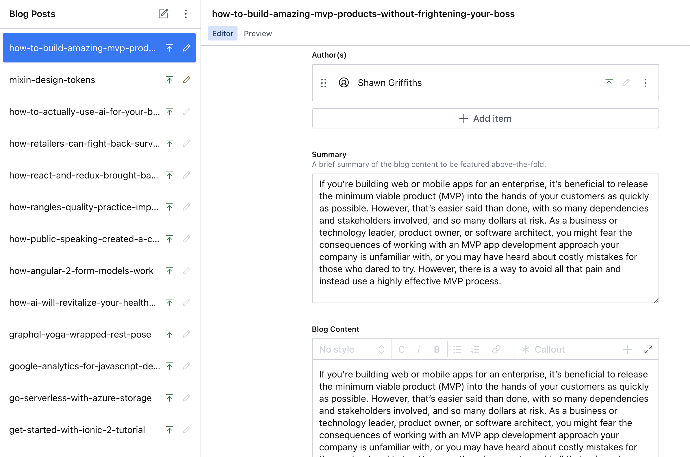 Rather than creating an author (or authors) every time we create a new blog post, we want to be able to reference them from a preexisting set of authors. Then, at a later date, we are able to easily change the author’s profile image, for example, in a single location and have that change be reflected on all of the blog posts.
