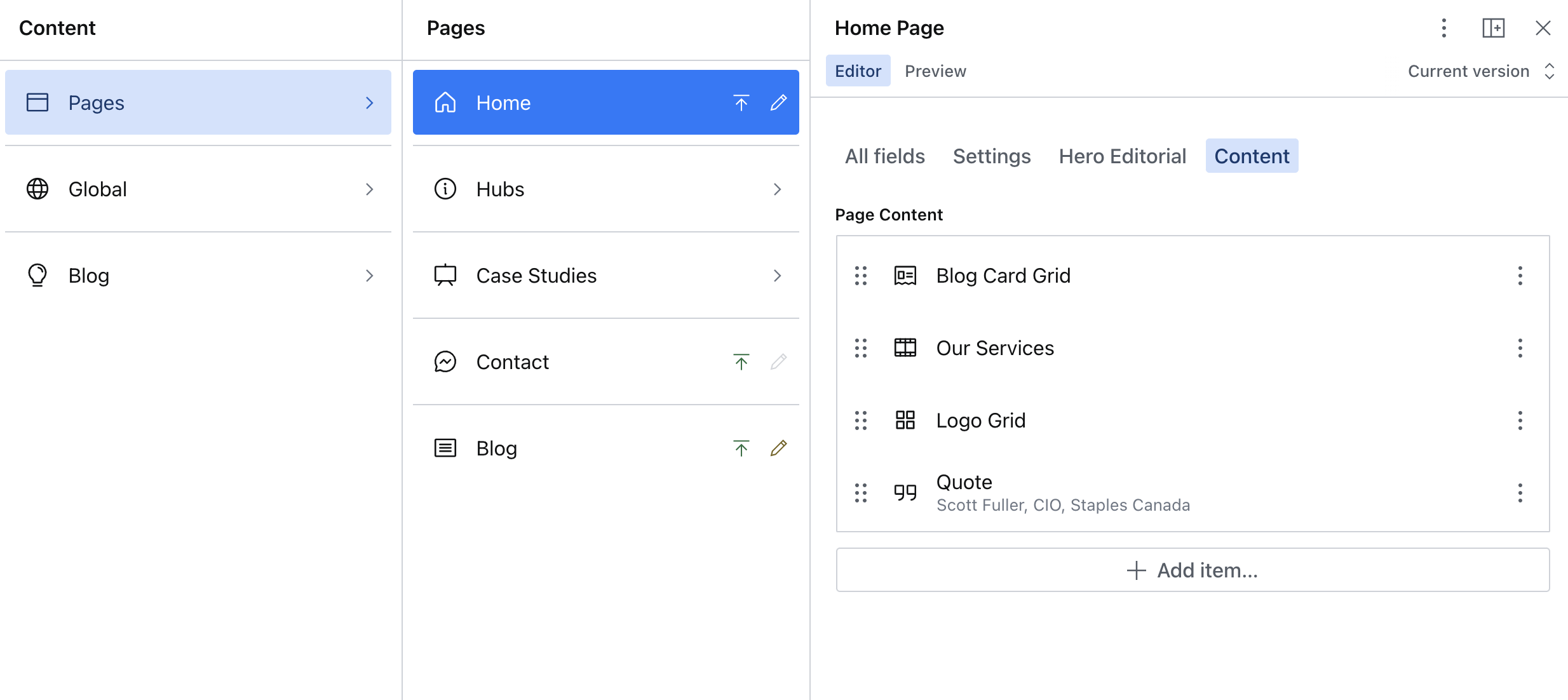 Alternatively, **hybrid** **pages** specify some fixed content and allow some specific sections of the page to be dynamic and reordered. This is the most common type of page content model we encounter. It gives the content author the right amount of flexibility without being too complex or tedious to edit.
