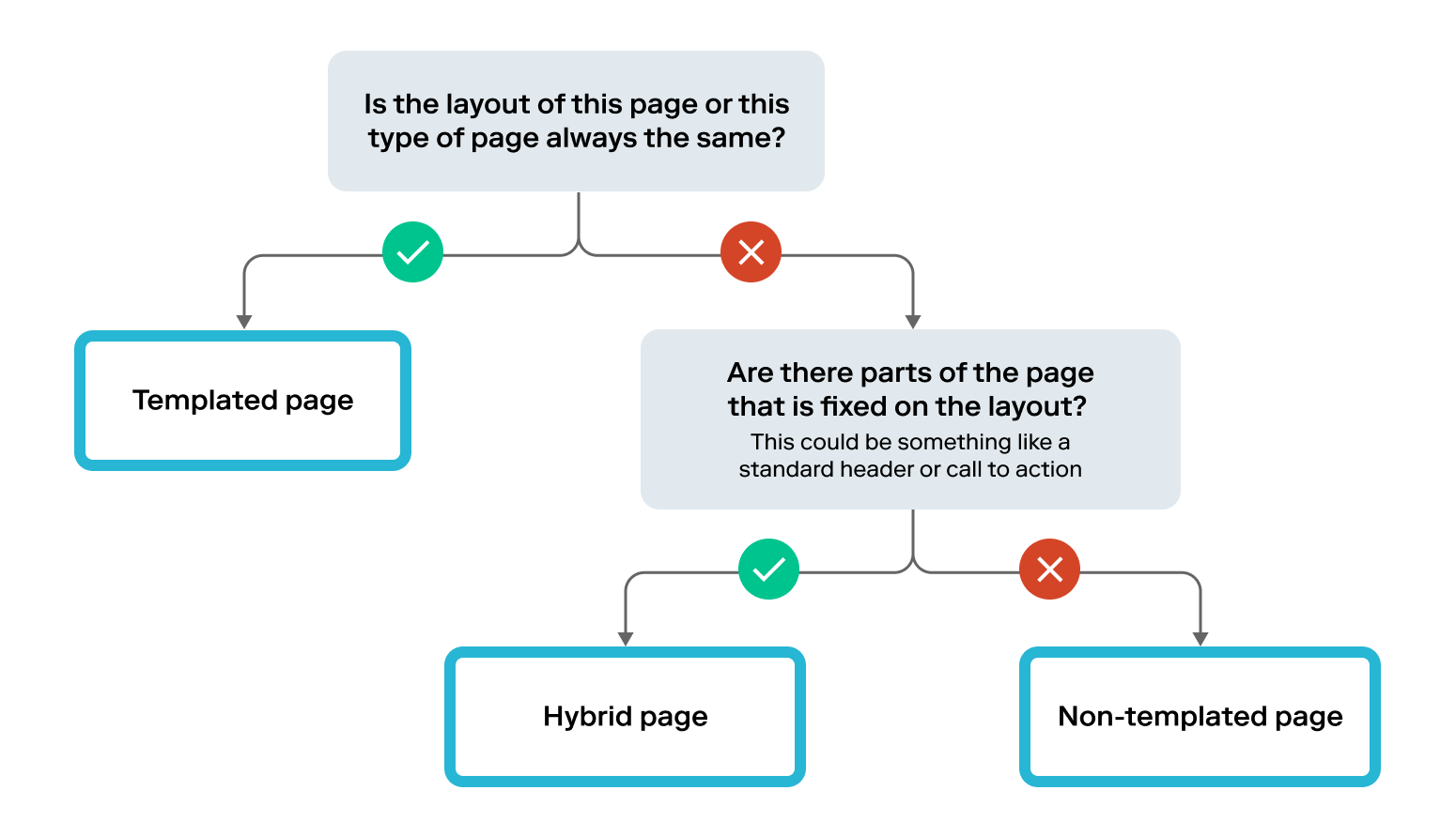 <figure><img src="https://882838265-files.gitbook.io/~/files/v0/b/gitbook-x-prod.appspot.com/o/spaces%2Fq7UE1cAwz12WuyrFSyXF%2Fuploads%2FnbCWFJgPJE0ekkwUbYzB%2F3a_what_to_use.png?alt=media&#x26;token=51f96cd2-71ff-4fee-b33b-003c25d885a7" alt=""><figcaption><p>Is the layout of this page or this type of page always the same? If yes, templated page. Are there parts of the page that is fixed on the layout? This could be something like a standard header or call to action. If yes, hybrid page; if no, non-templated page.</p></figcaption></figure>