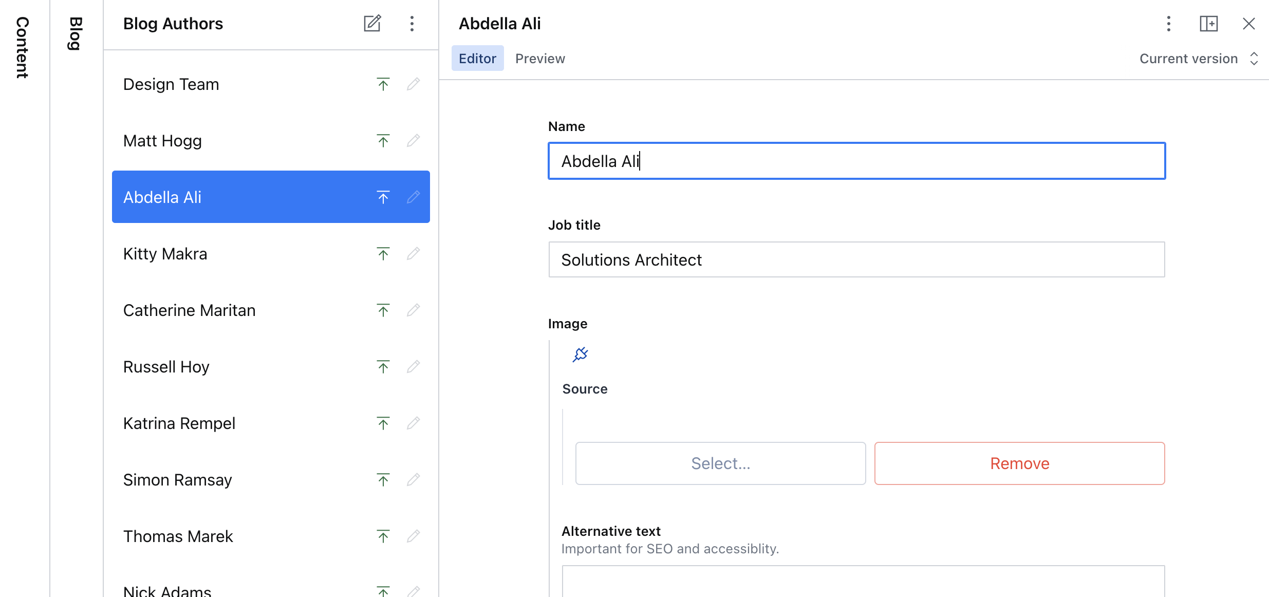 <figure><img src="https://882838265-files.gitbook.io/~/files/v0/b/gitbook-x-prod.appspot.com/o/spaces%2Fq7UE1cAwz12WuyrFSyXF%2Fuploads%2FzLTvRQJf6GitIk5JfqbB%2Fblog1.png?alt=media&#x26;token=7370930d-c926-415a-8364-485a453283bb" alt=""><figcaption><p>A list of authors created through the Author content model in Sanity.</p></figcaption></figure>
