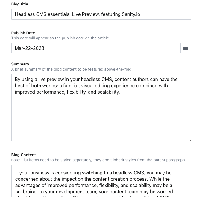 Let's take a blog post as an example. Users can input the title, date, summary, and body of the blog post.&#x20;